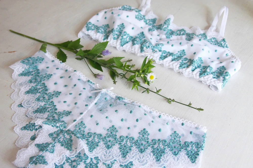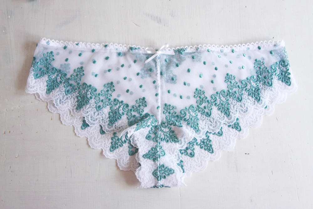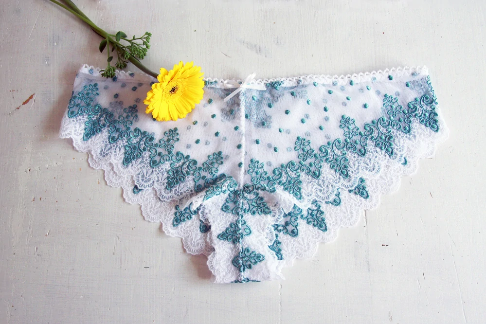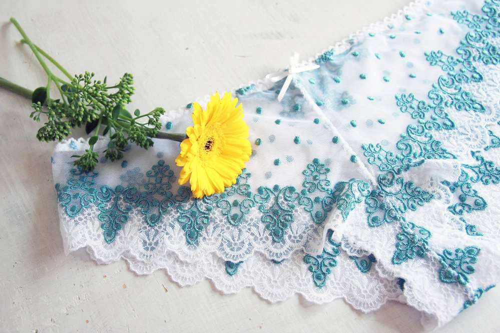 Nádherné, něžné francouzské kalhotky z dvoubarevné krajky v bílé a jemně tyrkysové barvě.