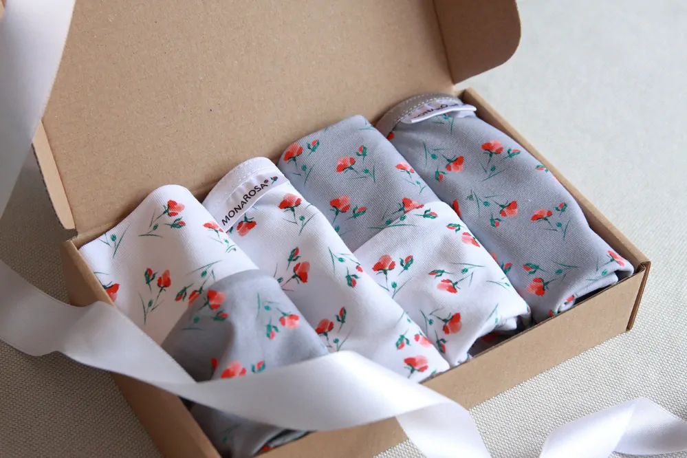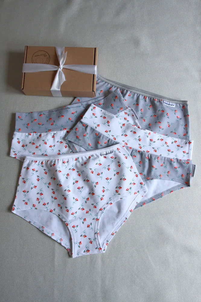 Set čtyř kusů dámských kalhotek z kvalitního organického bavlněného úpletu s autorským potiskem. Kalhotky mají vyladěný střih, který skvěle padne, jsou pružné. Podíl bio bavlny je 95% zbývajících 5% tvoří elastan, pro lepší přizpůsobení postavě a pro delší trvanlivost.