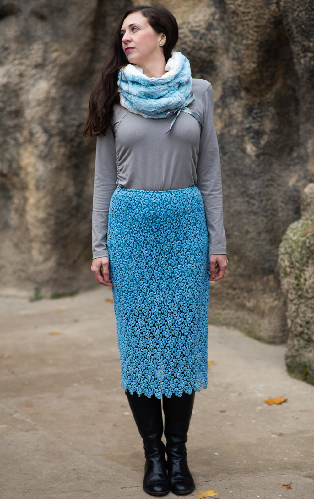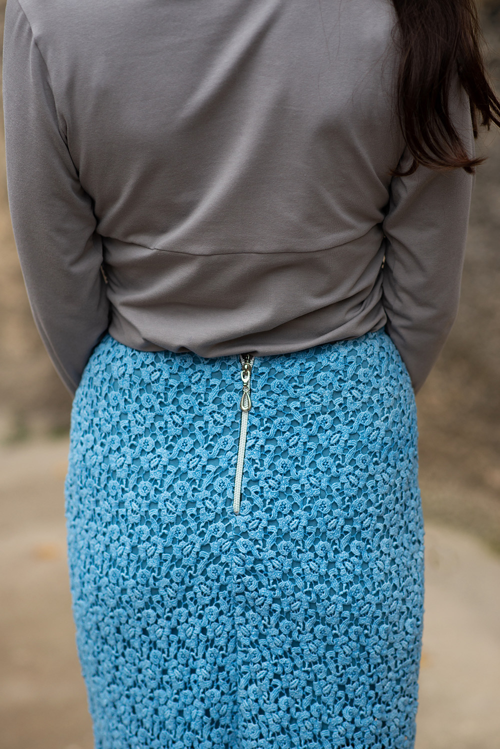 Jedinečná originální sukně vyrobena z kvalitní bavlněné - hodně pružné krajky v nebesky modré barvě. Sukně má podšívku z viskózového úpletu v téže barvě, v délce nad kolena. Vzadu se zapíná na kovový stříbrný zip a háček s očkem.
