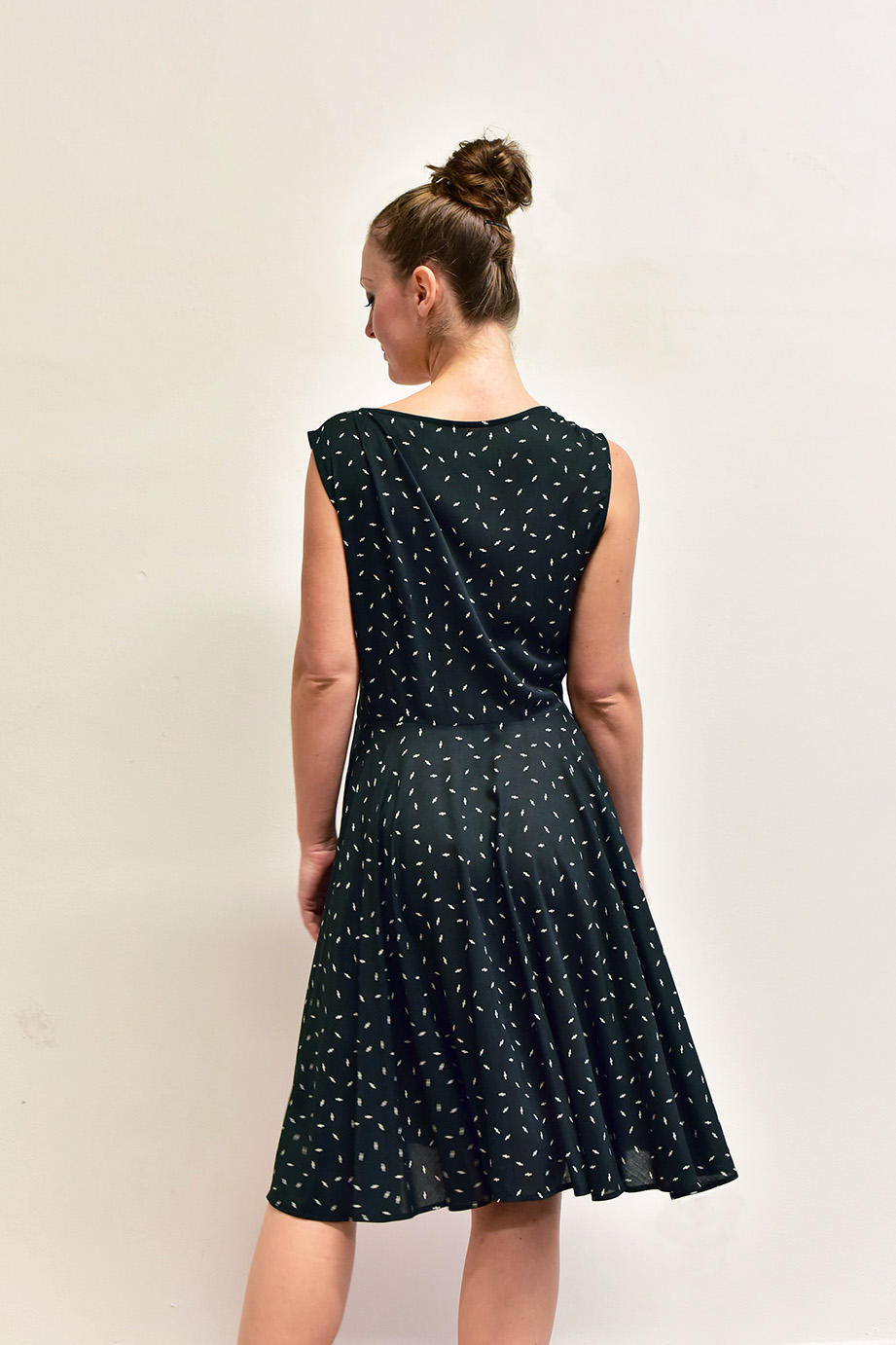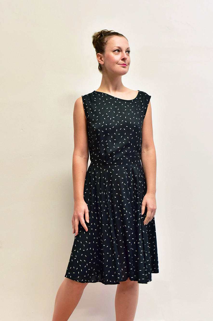 Něžné šaty s kolovou sukní jsou vyrobené z jemného splývavého viskózového batistu. Látka je potištěna drobným motivem - PIEROT - a patří do kolekce DELL'ARTE.