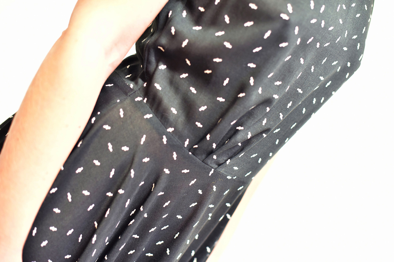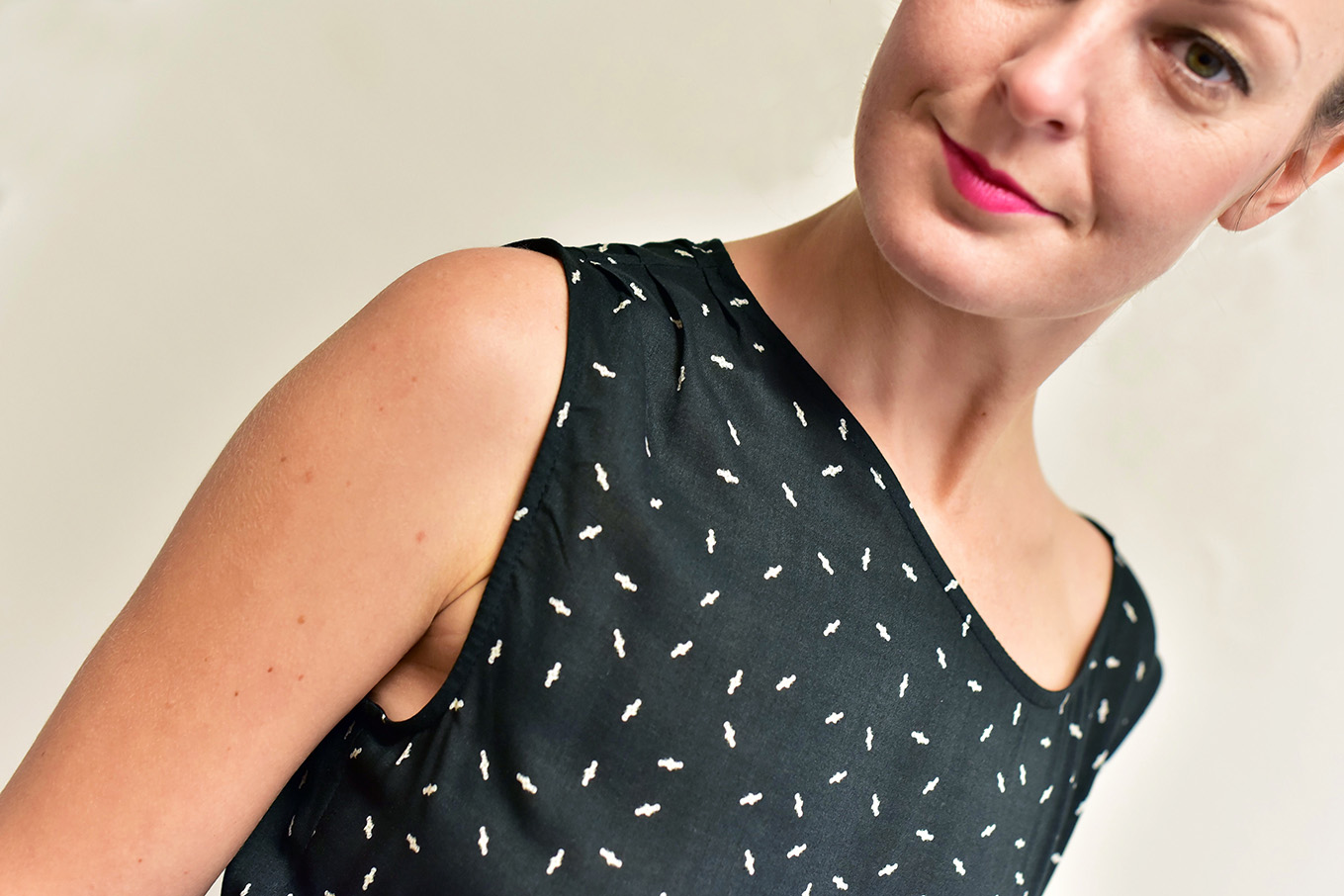 Šaty se zapínají v boku na skrytý zip. Na pravém rameni a v pase jsou vytvořené 3 záhybky, průkrčník je střižen asymetricky. Jedinečný model, vyroben pouze ve třech kusech.