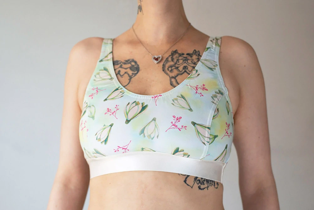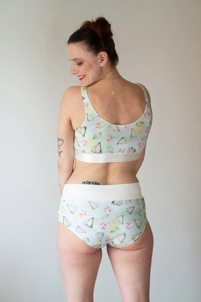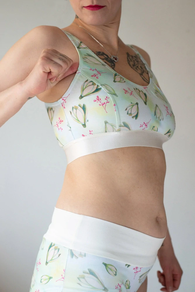 Podprsenka z organické bavlny s jedinečným autorským potiskem malovaných květin na akvarelovém podkladu. Potisk vznikl ve spolupráci s akademickou malířkou Markétou Šafárikovou.