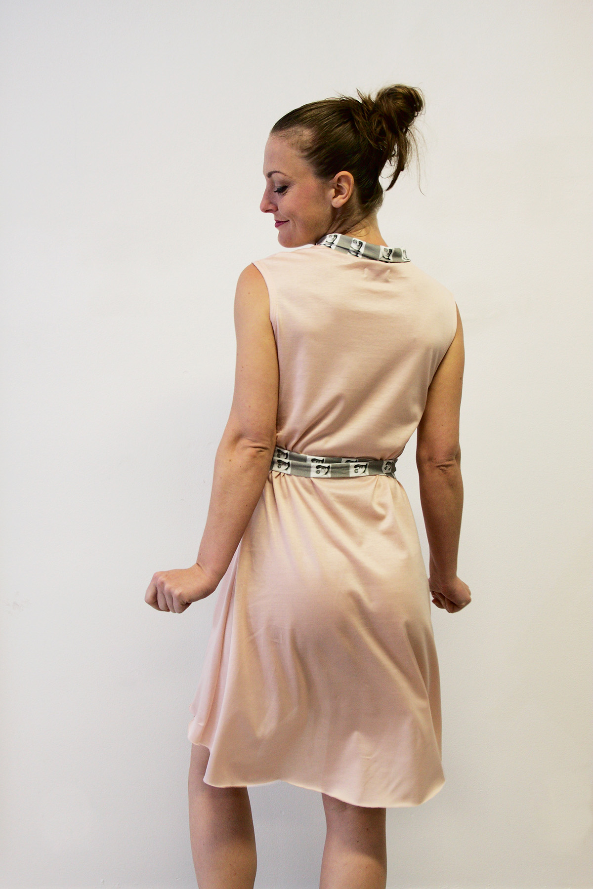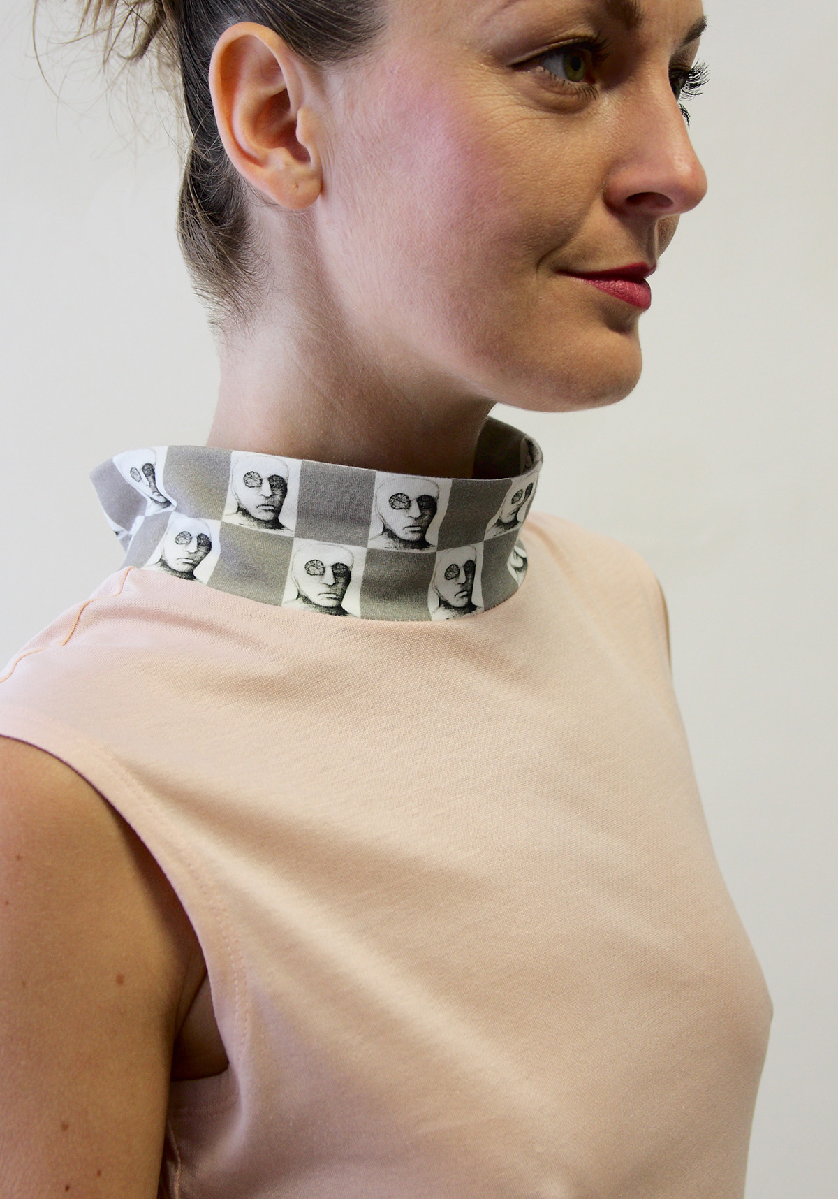 Šaty jsou vyrobené z kvalitního polohedvábného úpletu pudrově růžové barvy a bavlněného úpletu s autorským potiskem ŠACHOVNICE. Používáme zde motiv - HLAVA - který rozehrává svou partii s šedými a bílými kostkami. Stojáček lze nosit vysoko ke krku nebo ohrnout na polovinu.