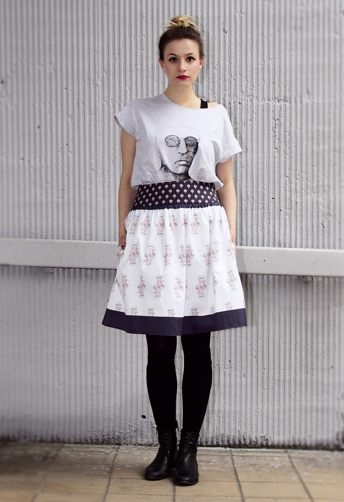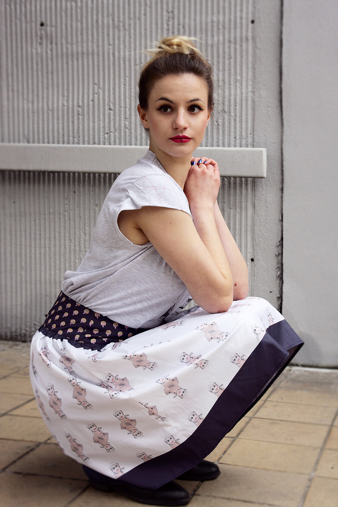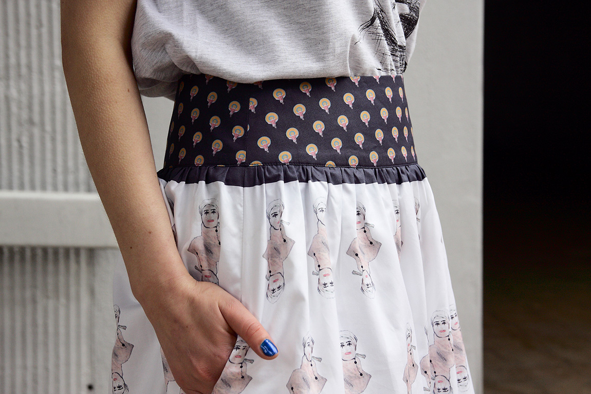Nekonvenční sukně s autorským potiskem z kolekce MonaRosa Dell'arte.