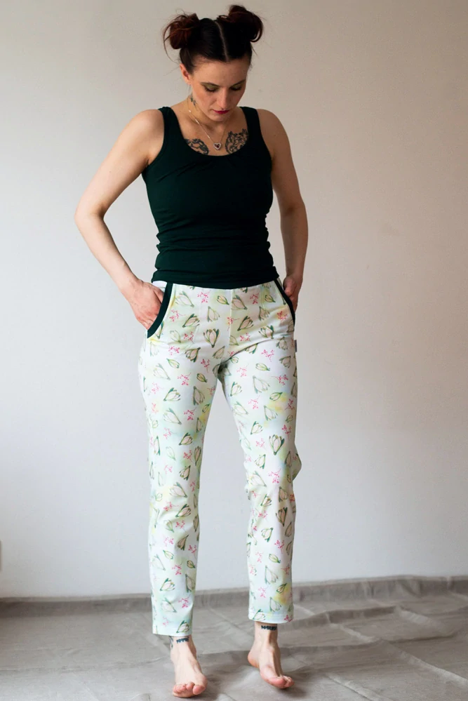 Kalhoty jsou mírně zúžené, mají kapsy lemované tmavě zeleným úpletem, který je použitý i na pásek.