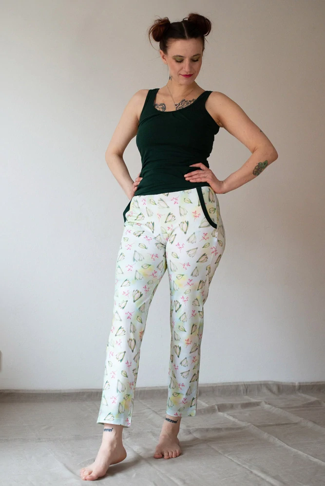 Dámské volnočasové kalhoty nebo tepláky z organického bavlněného úpletu s autorským potiskem, velmi příjemné na omak. Pečlivě vyrobeny v ČR.