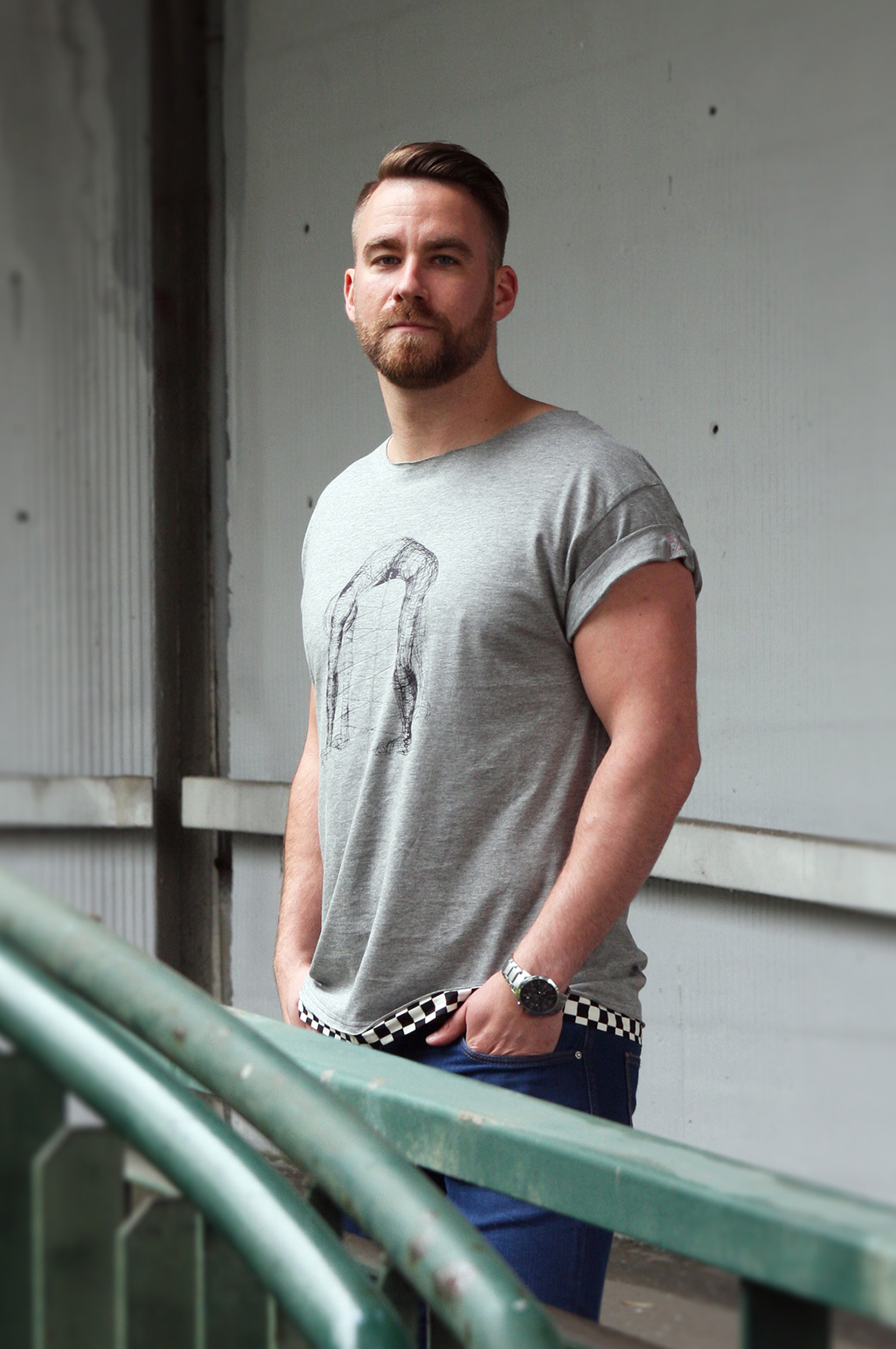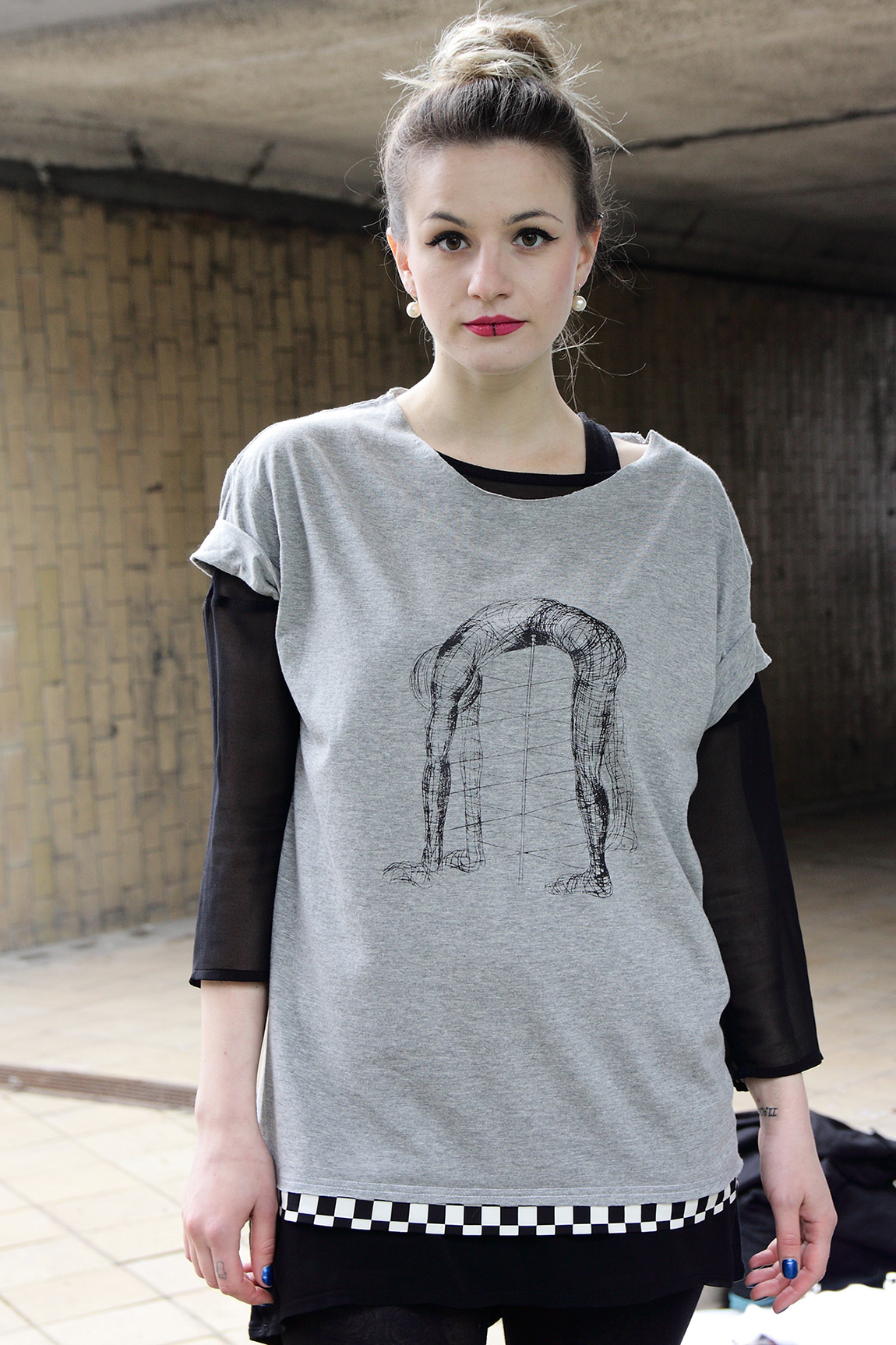 Triko je vyrobeno z bavlněného úpletu v šedém melíru. Je digitálně potištěné motivem AKROBAT, rukávy jsou ozdobně prošité šedou a růžovou nití, dolní kraj zvýrazňuje šachovnicový lem ze 100% bavlny.